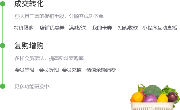 生鲜配送小程序助你构建更广阔的销售平台,薄利多销, 在销售数量上获得更大的优势。帮你打造属于你自己微 信生鲜蔬菜配送渠道,降低配送成本,获得规模效益。